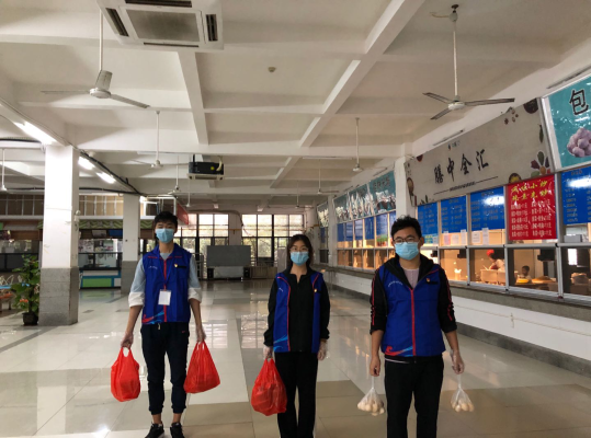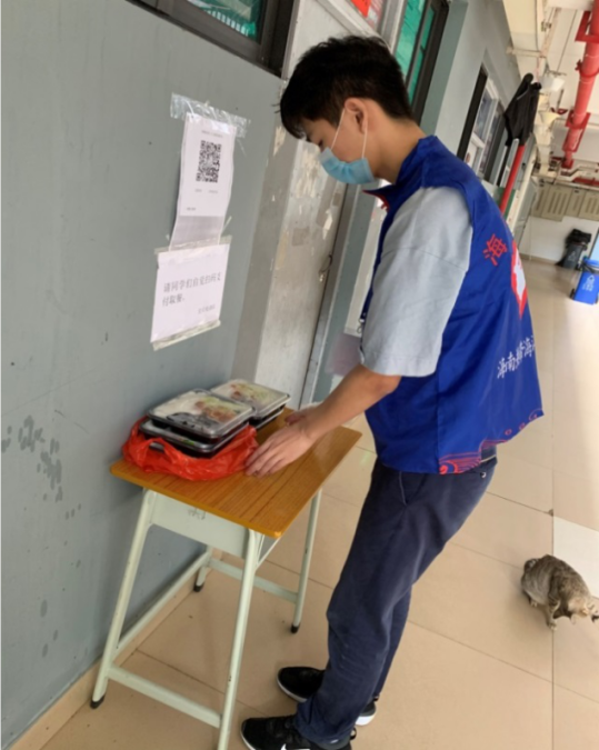 加入防疫先锋队,为隔离同学们送餐,保证同学们的一日三餐;一对一帮扶隔离同学,为其购买生活日常用品、领取快递。
